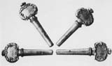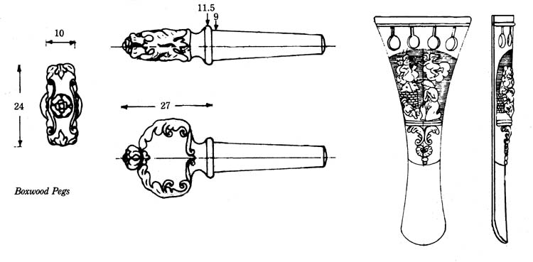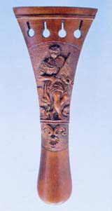 Ernest E. Doring’s editorial footnote to Harvey S. Whistler’s treatise on J. B. Vuillaume, published by Lewis in Chicago, l947, says that although it cannot be confirmed that such tailpieces and pegs originated with Vuillaume, it probably is the case; he also says that they were later taken up by other makers. Corroboration of this comes from David Hill of W. E. Hill & Sons who informs me that a dozen or so sets were made in their workshops during the 1920s, some being fitted to their own five copies of the ‘Messie’. The Gillot - Emperor Stradivarius, 1715, overhauled by Hills in l910, was fitted with one of their sets at about that time while owned by Jan Kubelk. Hamma’s Italian Violin Makers illustrates this superb instrument and clearly shows the fittings as they are today. Replacements are not necessary because of wear of the peg shanks but, as relief carving in boxwood is vulnerable, the pegs’ main attraction of crispiness soon becomes blurred, even with everyday handling. Victorian beards have played havoc with some tails. The close-up of the ‘Chanot’ tail seen on this month’s front cover shows the quality of carving well. This design is a variation on the Orpheus theme - he is not with his lute but with his violin - first realised by P.A. Maffei in Gemme Antiche Figuate (Rome, 1708) and subsequently used by Jules Galley as the frontispiece to his publication Italian Luthiers of the 17th and 18th centuries (Paris 1869). Orpheus is in fact depicted playing to wild animals, hence the figures at his feet. The ‘Chanot’ pegs, which are surrounded by deep relief carving of leaves and scrolls terminating in a rose, complement the tail perfectly. The centre is left plain except for the facets left by the carver’s tools (no sandpaper or rubbing down here), adding a certain simplicity to the design, as well as being practical. Some Napoleonic pegs have a somewhat extended rose giving a distinctive emphasis to the design. The endpin with its turned boss, which is slightly recessed to leave a centre button, completes this display of fine miniature carving.