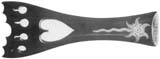 The fittings that adorn the ‘Messie’ today (see line drawings) are conceived around the nativity. The story surrounding the ‘Messie’ is too well known to be repeated here, save that Vuillaume must have been guided by its history when designing this particular tailpiece. The association is apt and cannot be put down to coincidence. The fittings are of a light hue with an ebony string saddle, whereas the ‘Chanot’ version is a deep chestnut with a box saddle. The peg designs are identical. The mounts of the Alard Stradivarius (this may be seen in the Hill Antonio Stradivari) are similar to the ‘Chanot’ except that the animals are missing. Altogether there are at least five designed variations with matching pegs. It appears that J.B.V. fitted Napoleonic mounts only to the cream of the Cremonese school and to a few of the masterly creations (typical examples of two such violins, Nos. 2541 and 2556, dated 1864, may be seen in the Musee d’Art, Geneva), from his own workshop although I have yet to find a del Gesu so equipped. On the ‘La Pucelle’ Stradivari, 1709, J.B.V. struck a more patriotic note using Joan of Arc as the subject. The ‘Lady Blunt’ Stradivarius, 1721, has mounts made and fitted by W. E. Hill & Sons in 1922. Surprisingly, Paganini appears not to have been portrayed, confined, as he is to darker regions, peeping from the inside of bow frogs. At least eight more sets, either with full or part decoration, may be seen in Goodkind’s Iconography but whether these all originate from Vuillaume it is difficult to say. Violas and cellos seem to have escaped attention completely. Napoleonic fittings in boxwood must never be confused with the numerous ebony tails that were manufactured to satisfy Victorian taste. The fact that violin fittings can be so easily changed gives this part of the survey an ephemeral quality, which is unavoidable. When did the modern tail with its now conventional gut fitting come into being? The ebony tail by Betts (below) gives us a clue. On this tail the gut is threaded through two steel staples driven into the underside and made secure by either clinching or riveting. This operation is screened by the inlaid silver starfish, its tail ascending to an elegant and probably original design to receive the strings: no gut is visible from the front and this tail carries no string saddle. That the Betts family were in business until c.1840 indicates that the transition to the present tail format was well under way by the middle of the 19th century. Therefore, it seems natural that Vuillaume’s inventive mind seized the opportunity and reinstates in a ‘modern’ way the old decorated tails of the Baroque period with their marginal stringing etc. If Vuillaume were creator of the modern tail we can be sure that it would have been recorded along with all his other inventions. Certainly, machine tools played a vital role in its production. Milling out the underside to take the tail gut lends itself to this method and would be a laborious task otherwise.