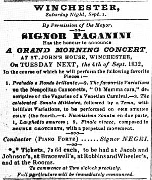Winchester, the ancient and venerable capital of England until the 11th century, has kept its royal connections. The marriage of Mary Tudor to King Phillip of Spain in the Cathedral in 1554 illustrates this perfectly. The Hospice of St. John was founded some say 932 AD, but certainly refounded in 1275 by John le Devinishe, by licence from Edward 1, for the relief of sick and lame soldiers, poor pilgrims and wayfaring men. It is the oldest of five such institutions. The main building stands in the Broadway, adjoining the Chapel of St. John the Baptist, and serves not only the 58 or so almshouses, but the whole population one way and another until the recent removal of the Magistrates Courts in l980. During the reign of Elizabeth 1 its functions took in every aspect of Civic and Corporate duties, from caring for the needy to the election of the Mayor. Originally called St. John’s Rooms, it consists of an undercroft with walls over five feet thick which support a more modern structure built in the 18th century. In the 19th century this was redesigned by lowering the floor and adding an extra storey, thus doubling the height from floor to ceiling. Now we have a glorious and impressive structure with Regency and Georgian decorations 30 feet high and floor space approximately 60 feet by 37 feet. The undercroft houses a superbly equipped restaurant and wine bar. The intention to approach the City Council with a request for the return of the paintings that originally hung there is sensible and important to the whole concept. The original six large windows are intact. Outside, using trompe l’oeil, imitation windows have been painted onto recesses that correspond to the actual windows, a pot of paint and a brush, also painted on, add realism. The view from the Mayor’s Parlour, Abbey house, opposite is impressive. A red canopy over the doors adds a touch of elegance to the whole. St. John’s House has been designated a grade one listed building. Until l939 it had always played a part in the musical activities of the City, with the great cathedral music festivals of the l8th and 19th centuries making full use of it. By the time Paganini played there in 1832 is was the principal building used for functions, ranging from fashionable balls to serious music, with the two often mixed as in Paganini’s case, his recital preceding a ball. Paganini’s first appearance in Winchester on 5th March l832 was his last concert of the l831-2 tour; he did not, as some authorities state play in Southampton this time. He left on the steam packet for La Havre on March 8. On returning to London from Paris at the end of June, he began a tour of the south of England, taking in Canterbury, Brighton, Southampton, Portsmouth, Chichester and again Winchester on September 4. This recital is glowingly reported on September 10. The concert on March 5 reported in the Hampshire Chronicle dated March 12 is of particular interest: not only does it re-create the atmosphere of the period but it goes a long way to explaining Paganini’s popularity and the aura that surrounded him. The pianist’s problems have changed little over the years - Mr. Long’s experience as Paganini’s accompanist shows his predicament only too well. The concert by the celebrated violinist Signor Paganini, assisted by a select number of the Band of Gentlemen Amateurs of this city took place at St. John’s House on Monday evening. The well-known and wonderful talent of this highly gifted artist attracted, as we expected, a numerous and fashionable audience. His power over the instrument he professes beggars all description. The solo, entitled “Sonata Sentimentale on the Prayer” in “Pietro l’Eremita” said to be executed on one string (the fourth) must have been heard with admiration by all who could appreciate the “treasure of sweet sounds” elicited from the instrument by this almost supernatural being. His last performance, “Nel cor Piu”, with variations, seemed to give the most unequivocal delight to the audience, and was rapturously encored. The Signor, however, was not persuaded, even by applause almost bordering on frenzy to come forward a second time. It must truly be said of him, that on earth we shall not look upon his like again, for he certainly is like nothing earthly.