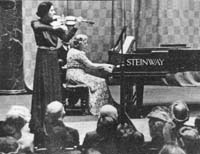 Her entry in the New Groves Dictionary records that she gave the first performance of the Arnold Bax concerto in 1943, and mentions her capacity for hard work. A fine interpreter of the classics, Kathleen Long being her principal duo partner, she gave first performance of the works of Ernest Moeran and Arthur Benjamin. Eda’s first important violin was made by Nicolo Amati (c.1650); however, her main work was accomplished on a violin made by J.B. Vuillaume, one of the best makers of the French School. A year or so before her death an important instrument by Joseph Guarneri del Gesu came into her possession. This acquisition and her promise of recording contracts was in preparation for the final stage, to consolidate the international recognition already achieved. Alas, this was not to be. Emerging from the minds of musicians contemporary with Eda Kersey there are still many today who remember vividly different aspects of her own working technique. These range from the rock like control and variety of nuances contained in her bowing to the almost ‘electric’ effect of her trills. The security in double-stopping maintained by clarity in very fast passagework remain in the minds of those artists it has been my privilege to interview in recent time. To sum up, her performances had depth and substance rather than being of a facile nature, all of which endeared Eda to her audiences, whether on radio or in the concert hall. Among us today are a number of very talented young string players: how many become endowed with the art of interpretation is another matter. There is no doubt that Eda Kersey was well prepared and poised to become one of an elite few, who can thrill us with a touch of magic. As a musical friend of long standing expressed it, she was the Kathleen Ferrier of the violin. This comparison she would have enjoyed, one of her strongest beliefs being that intelligent string players should learn much from their fellow artists. This was the basis on which Eda’s work was founded; for instance, a violinist can absorb much about legato playing by simply listening to a gifted singer. Besides broadening the horizon, it strengthens ones ability to communicate. It also teaches us humility. Eda gave so much time to the National Gallery lunchtime concerts that it is not possibly to be very specific, except to say that many recitals were presented from 1939 until a month before her death in l944. Always with her then was her principal duo partner Kathleen Long, joined when the music demanded by James Whitehead, cello. In l947 the Eda Kersey Memorial Exhibition was established, the trustees being the Royal Academy of Music, designed to help each year a suitable young violinist, this continues to operate to the present time, a fitting tribute to the memory of Eda Kersey. During the preparation of this homage to one of England’s leading musicians it became abundantly clear that the devotion of her sister, Rosalie, played an important role. To Rosalie, I am indeed grateful for her recollections after a lapse of four decades. By her interest and indefatigable industry, Eda Kersey contributed greatly to the art of music. The epitaph on her memorial plaque in the Golders Green crematorium aptly sums up the part that all musicians play: ‘They will maintain the fabric of the world.’ It is particularly appropriate today. |