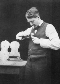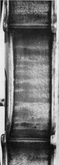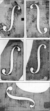 f-HOLE PATTERN COLLECTION George Wulme Hudson’s addiction to detail is underlined by a collection of f-hole patterns amassed during his career. Every new example that came his way had to be recorded first by a paper and pencil rubbing and then transferred to any suitable stiff material, such as card, rib wood, veneer or cigar box mahogany. Those illustrated are from a collection of over 100 which includes Antonio and Omobono Stradivari, a special favourite, Guarneri, Amati, most of the classic Italian makers and it even takes in a more remote maker, Angelo Soliani, Modena 1790. The Gagliano family are also well represented. The French makers do not escape notice, with a J.B. Vuillaume and one by Jacques Thibout. The only English f-hole is an example of a John Lott ‘del Gesu’. The presence of one f-hole taken from a Bernardel cello is surprising. Does this indicate that Hudson may have contemplated making a cello at some point? Exact measurements and makers’ names are on most f patterns. In some cases a pair have been taken in-situ. The precision with which these patterns have been executed give them interest outside their main function. Every maker has his critics and Hudson is no exception. But when a maker employs such enormous versatility it is dangerous to be dogmatically critical. However, some Strad models made in the best period are massive in a few respects, not in the measurements which are faithful to Stradivari, but in the impression given by leaving the rims a little thicker and by making the centre rib joints with the end grain of both ribs exposed. Some mitres are finished with a black mastic (Jacques Thibout, the French maker whose mitres are invariably massive, seems to be the inspiration here). Other mitres look more elegant with a thin slither of ebony dividing the two ribs. The delicately inlaid purfling with the Strad half-dowel feature maintains a good balance in spite of a slight squareness to the outline of the head: a consummate skill in carving is in evidence here. The scrolls are bold and assertive, the pegbox is practical with strong sides and easy access to the strings, and the fluting flows from the back of the pegbox to the scroll in a most natural way. The result is that these instruments have a masculine character that enhances their overall beauty. Hudson left the maximum amount of wood in his plates, some say too much, but it is to his credit that he would not budge from his principles to get quick results. His violas have come in for criticism in this respect. As years go by his tonal aspirations are being realised and recognised by many discerning players. When it comes to exact copy Hudson has few equals. Every aspect is taken care of: the rib mitres are feathered to conventional form, rims are normal etc. A Joseph Gagliano copy for instance takes in all the character of that maker. In the case of Gragnani or Gabrielli, a metal brand would be made. All this has led some critics to dub Hudson a mere copyist, a faker, and the like. Hudson had no illusions about this and his views are summed up in his own words: ‘Although dealers, experts and others have decried the making of copies, fakes etc. there is no denying that to make speculation violins is not only interesting but profitable, for as a rule a copy will sell quicker than a new one. So many players prefer an instrument that looks old, and a copy or reproduction can be a good fiddle if it is well made of good wood and not ruined by acids etc.’ It can be observed in Henley that after due praise Hudson is castigated for his copy work, while a contemporary, Annibale Fagnola 1865-1939, receives only acclaim for his splendid replicas. One is tempted to ask, what exactly is the difference? Common sense dictates that replica and copy work are the same and legitimate, only when labelled deliberately to deceive do they become fakes and unlawful. Hudson seems to have enjoyed some leg pulling in this area. How else can his habit of making and printing fictitious Italian labels of names such as Marezzi, Galieno etc. be explained? The insistence on including his own name somewhere in the interior defeats any attempt at deceit and is perhaps best described as harmless hoodwinking. Hudson’s work in copying those makers outside the mainstream of the Italian school is probably unique - it is almost tantamount to an obsession. It is worth observing here that copy work must be closely allied to fine restoration as far as ground work (colours) are concerned. Perhaps the copyists are doing a better job than we give them credit for. An ability to vary the texture of varnish to match a particular school of making plus access to many fine instruments over a long period and his own keen sense of observation, gave George the edge over many of his English contemporaries. His shaping of the neck and fitting up were impeccable. He always made a neck graft in his own way. The butt joints where the graft terminates in the pegbox take a downward trend. These joints were never feathered (one and a half hours was considered ample time to do this). Unless it was to contrast the figure or use up off-cuts there seems no logical reason for this. A number of violins are capped with ebony. Although this is neat and tidy, nothing sets a back off better than a distinctive button. Immediately the eye is attracted to this small but very important finial.